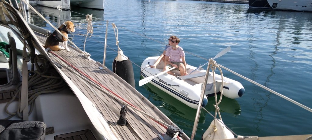Als ze terugkomen zijn wij anker op gegaan want we kwamen door de draaiende wind in de knoop met een vissersboeitje. Pieter brengt Milou en Lennard met zijn dinghy bij ons aan boord en daarna ankeren we opnieuw op een betere plek en bovendien heeft Pieter de vissersboei nog even 100 meter versleept.