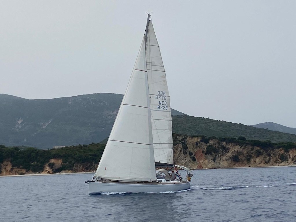 Eenmaal buiten de beschutting van Kefalonia aan BB draait de wind 35 graden naar het westen zoals voorzien. Daardoor kunnen wij flink afvallen naar het puntje van Ithaka aan stuurboord. Met 2 reven en een half uitgerolde genua scheuren we er vandoor naar Lefkas met een maximum snelheid van 8,9 knopen.