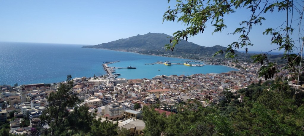 De volgende ochtend, 20 mei, tuffen we in de windstilte de laatste 16 mijl naar Zakynthos stad, waar we om 13:30 uur aan de buitenpier aanleggen met ons eigen anker vooruit en de spiegel naar de kade, zoals bijna overal in Griekenland. We tanken diesel van de plaatselijke Shell dealer die met een kleine tankwagen de hele haven bedient, lekker handig.
