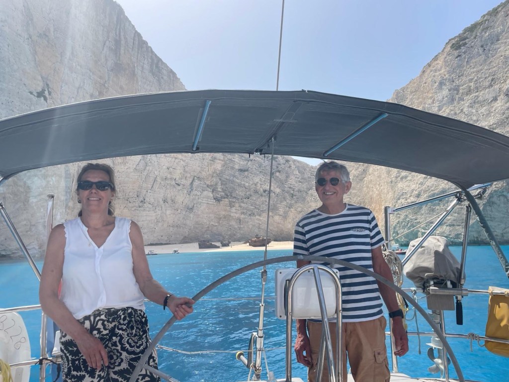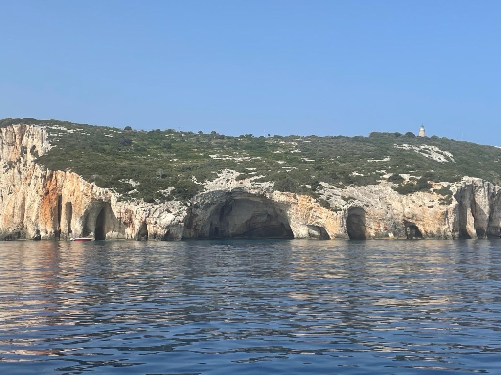 Op 18 mei motoren we 26 mijl naar de noordpunt van Zakynthos. We leggen aan in Agios Nikolaos, waar Dimitri de kade, het tankstation, de winkel en het restaurant van zijn zus bestiert. Ook vaart hij met een toeristenboot langs de blue caves die net buiten de haven liggen. Hij doet het met veel vriendelijkheid en geniet van het leven.