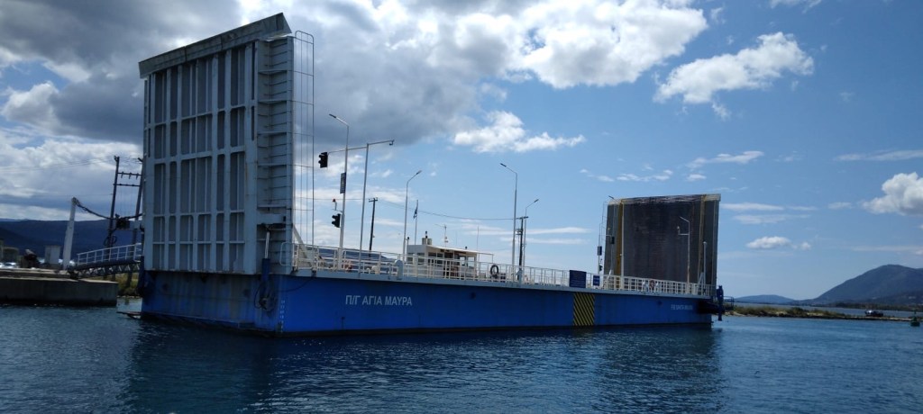 11 mei varen we met de prima werkende keerkoppeling de haven uit. Een uurtje motoren later zijn we bij de brug tussen het vasteland en Lefkas, die er iets moderner uitziet dan in 2016,maar in wezen is het nog steeds een veerpont, die met beide zijden uitgeklapt precies de breedte van de stroom overbrugt. Drs. P zou er stil van worden.