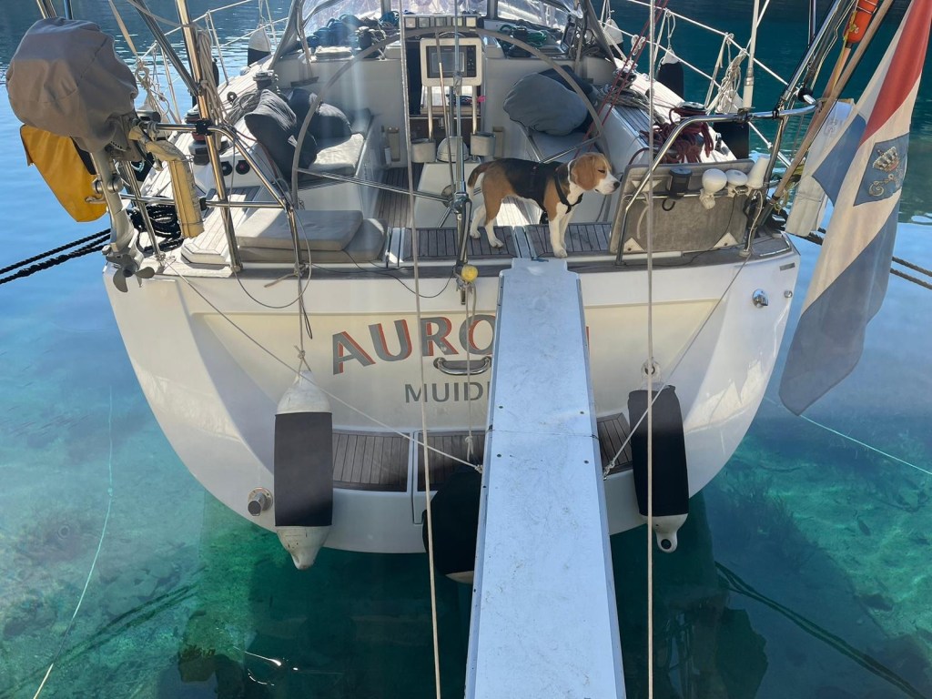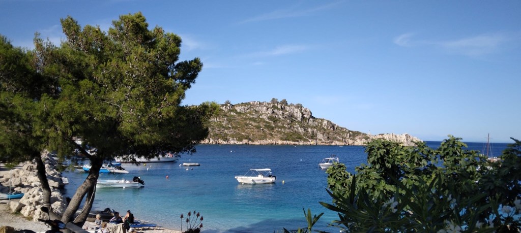 Daar liggen we prachtig en beschut in het zuidelijke hoekje van de baai in 8-10 meter diep water vlak bij het kiezelstrand. We controleren voor de zekerheid het anker met de snorkel (Lennard offert zich op om in het water van 17 graden te springen). Het is prima ingegraven dus we gaan met de bemanning van de Goodwin een borrel halen bij de enige strandtent die al open is zo vroeg in het seizoen. Een goede CS met een score van 9,25 ondanks dat de lekkere hapjes niet gratis waren….