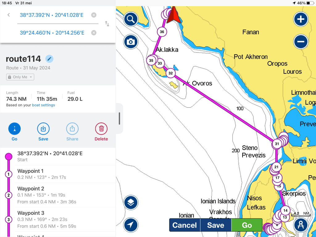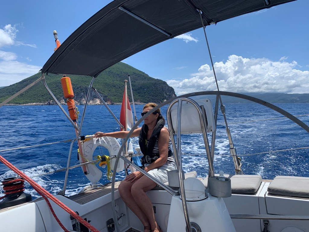 Om 11:15 uur gooien we los om richting Syvota (Lefkas) te varen. In de straat tussen Ithaka en Kefalonia staat eerst nauwelijks wind maar hoe later het wordt en hoe noordelijker we komen, hoe sterker de wind wordt. Meer dan 15 knopen wordt het niet, zoals voorspeld.