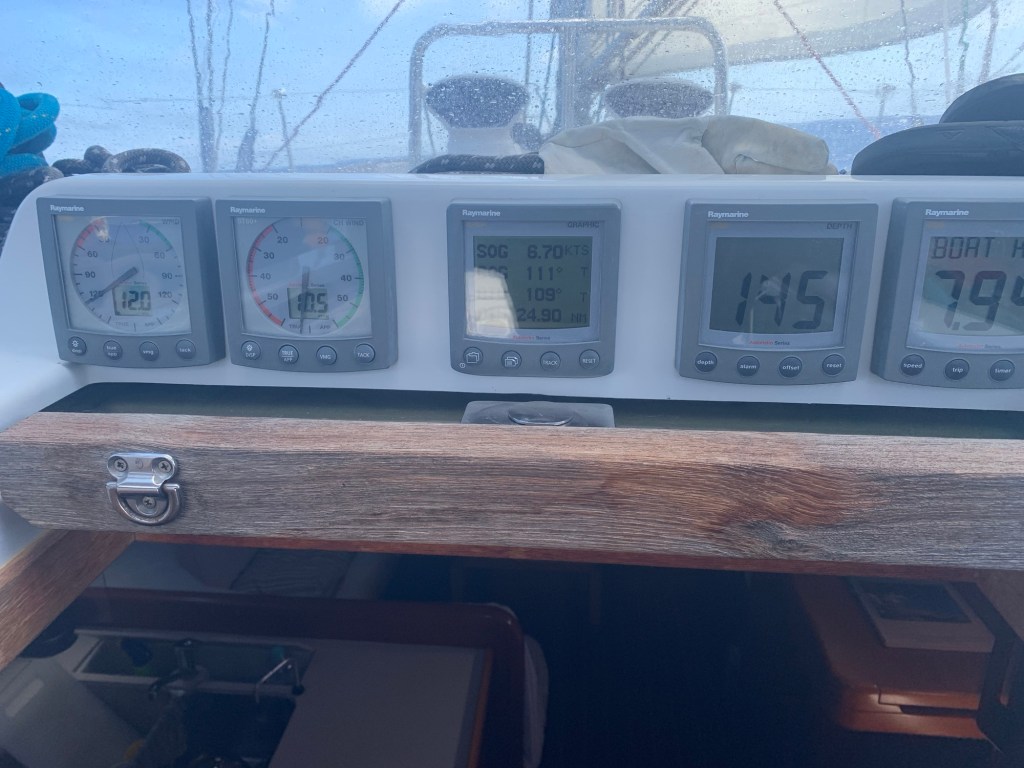 We zeilen heerlijk met een TWA van 120 dus optimaal hoewel de golven eerst nog vervelend zijn door een kruisdeining. Regelmatig lopen we boven de 8 knopen ondanks de conservatieve zeilvoering.