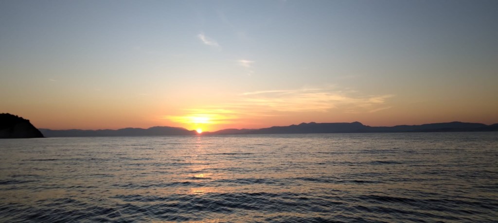 We varen om 7:45 uur weg net voor de zon opkomt. Op zee zien we hem opkomen boven de bergen van Albanië. Eos rhododaktylos, ofwel Aurora.
