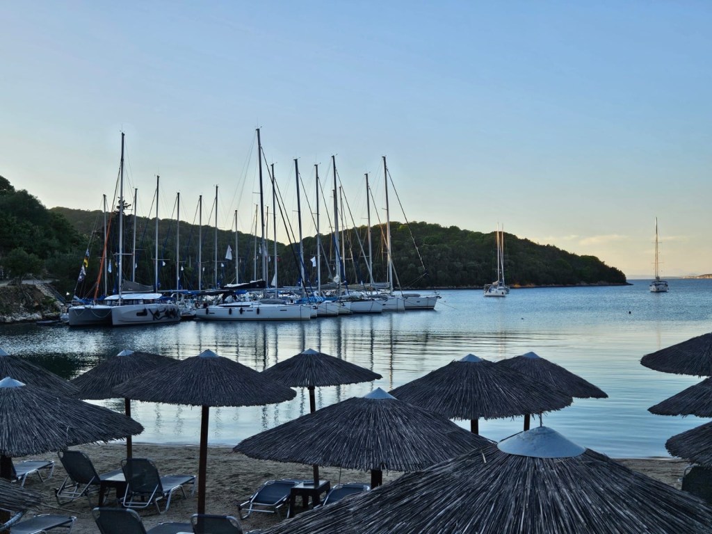 Om 14:30 uur praaien we de familie Dammers, die voor anker liggen met hun gehuurde Bav51 in het baaitje voor Sivota. Wij varen alvast door naar de steiger van restaurant Karnouvo waar we met hen hebben afgesproken. Na 17 jaar zien we elkaar weer en we praten door alsof het gisteren was, dat we elkaar voor het laatst zagen. Het werd gezellig maar niet te laat in het restaurant, want de kleinkinderen moesten natuurlijk wel een beetje op tijd te kooi.