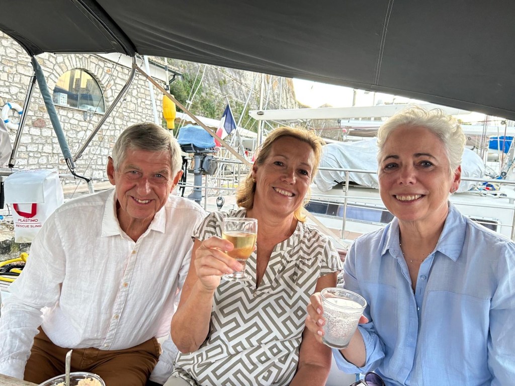 Henriette en Machiel komen met hun Shipley ook binnen en we drinken een mooi glas Griekse witte wijn bij hen aan boord, gezellig om hen te leren kennen!