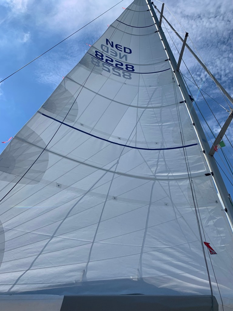 Er is heel weinig wind dus we kunnen het nieuwe grootzeil niet goed testen maar het staat er wel goed op.