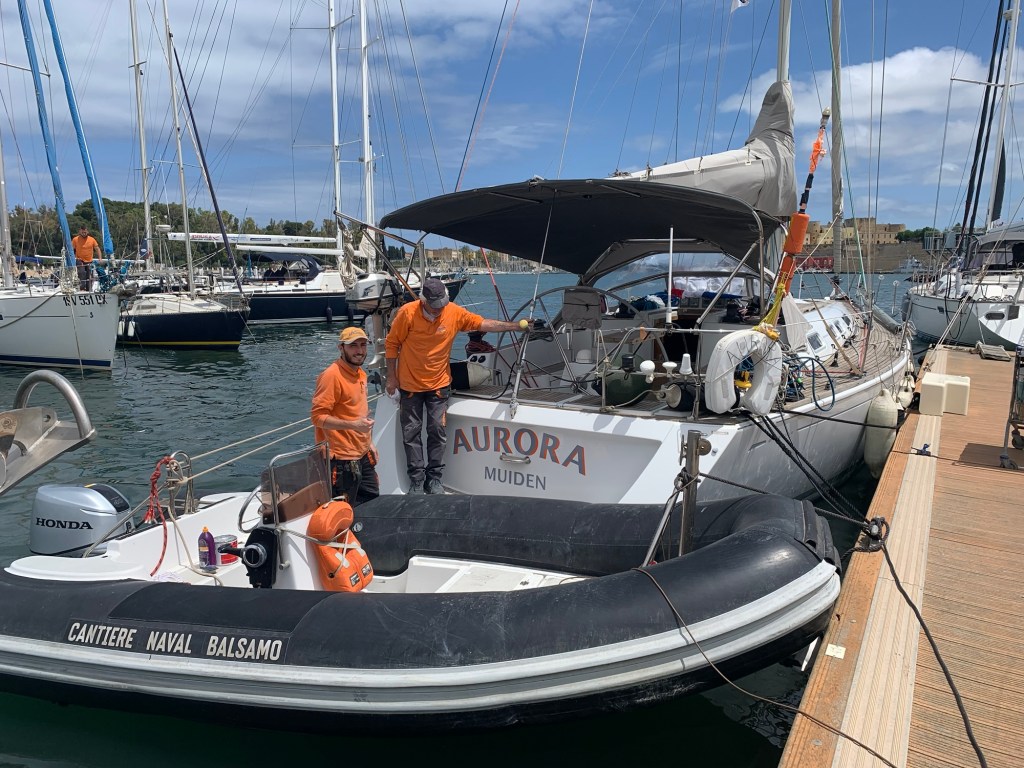 Maandag is het direct poetsdag. Binnen is het vooral stoffig maar ook een grote bende omdat de werf de watertank heeft vernieuwd en ze daarom alle spullen, inclusief matrassen, in de kajuit hebben gelegd. Buiten is het ook veel te doen. Met name het dek is erg smerig en dat moet schoon zijn als dinsdag het nieuwe grootzeil wordt gebracht door Onesails uit Lecce. Het zeil is van hetzelfde materiaal als de genua, die we door de loft in Marina di Ragusa een paar jaar geleden lieten maken. Het staat er mooi op!