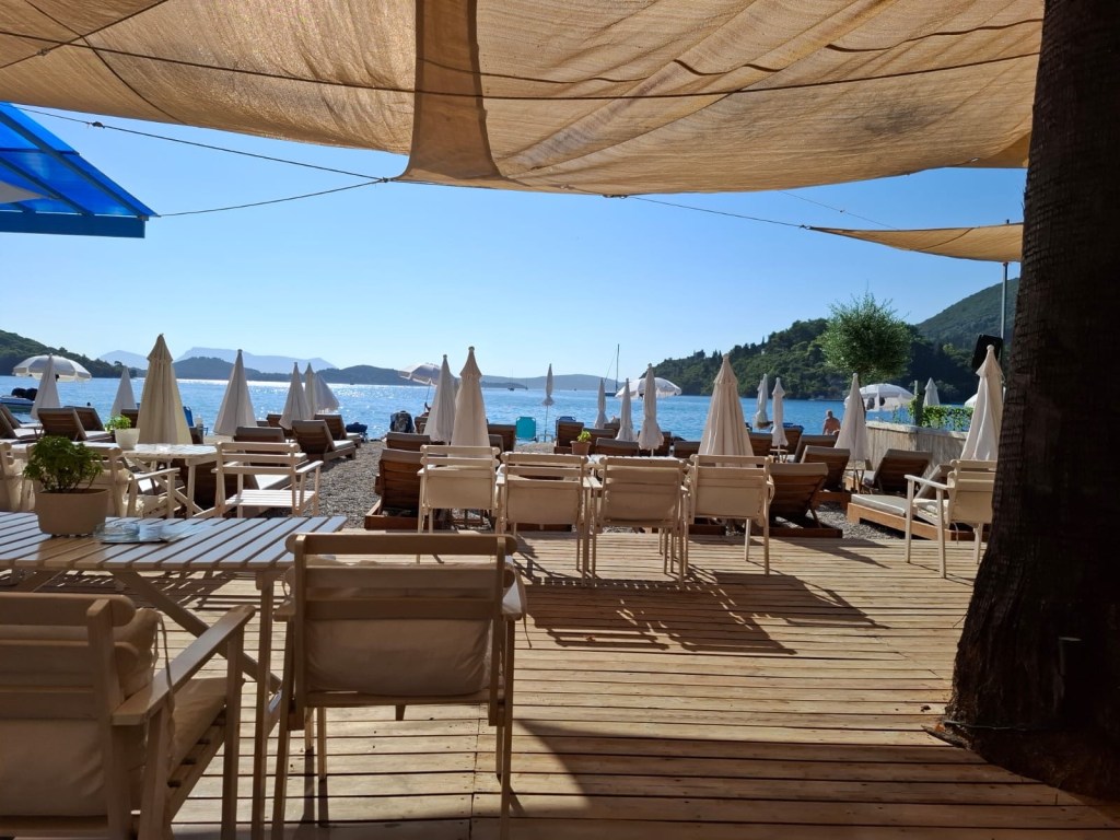 We varen op de 14e naar Nydri waar we een plek krijgen bij het pontoon van het Iris premium hotel. Dat klinkt hoogdravender dan het is maar het is wel een heel gezellige plek.