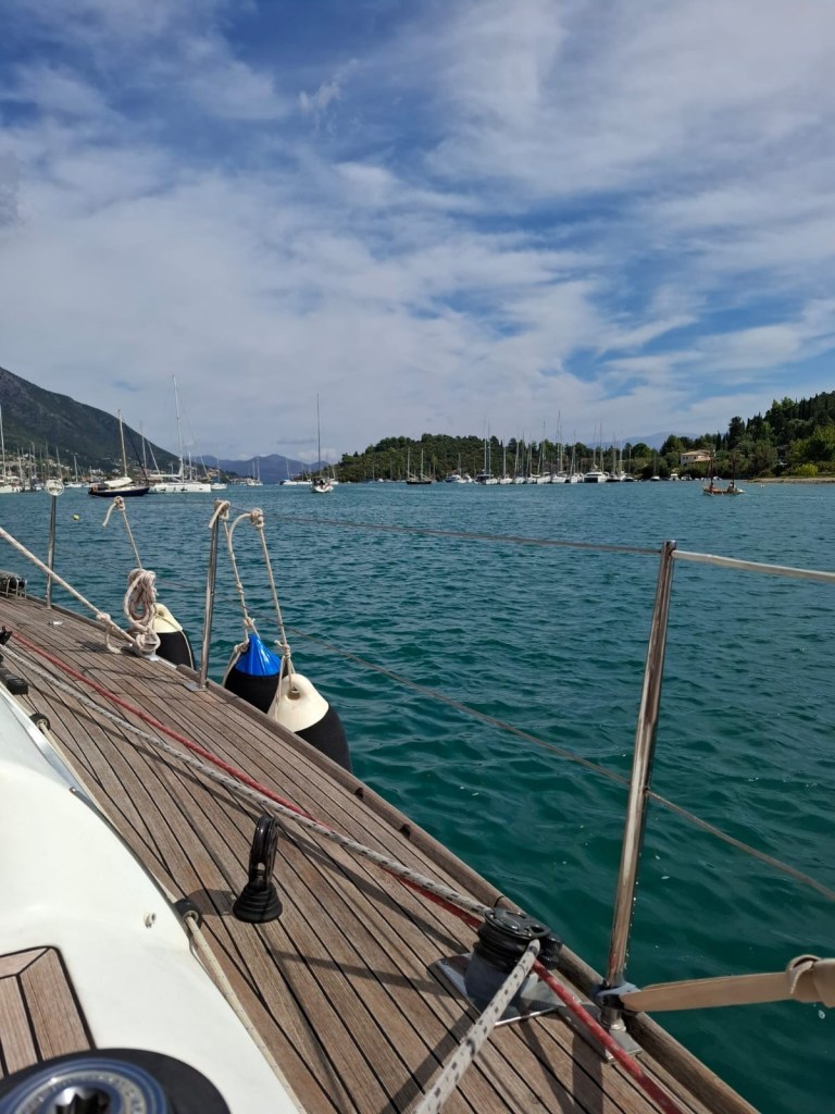 Als we de baai bij Nydri invaren draait de wind 180 graden, maar blijft heel weinig. We leggen aan bij Sail2day, waar ze een plekje voor ons hebben wat op een zondag best bijzonder is omdat alle charter boten op zaterdag of zondag hun wisseldag hebben.