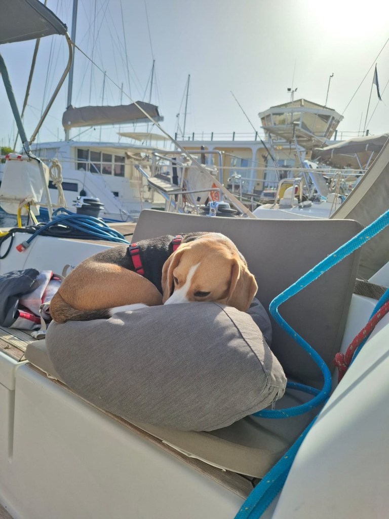 We blijven dus 4 dagen liggen, doen klusjes, blazen nieuwe sup op en luieren. Het is warm en bovendien is er woensdag veel wind voorspeld en hier lig je beschut. We maken wel onze 7000 stappen per dag door vroeg in de ochtend te gaan wandelen of boodschappen doen.