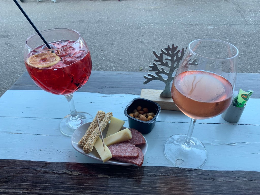 We leggen aan bij hotel Armonia omdat er geen plek is bij ons geliefde Iris hotel pontoon. We gaan wel bij Iris borrelen en eten want hotel Armonia blijkt gesloten.