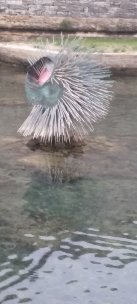 Kunstwerk in het water voor de burcht, een zee egel van formaat….
