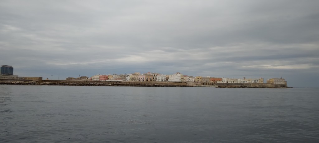 Luigi regelt weer een mooie plek voor ons bij de haven van de gemeente, die niet direct te benaderen is. We gaan hier 4 dagen blijven wat het gaat echt hard waaien, 35-40 knopen uit het noorden. Maar Trani is wel een leuke plek om dat te doorstaan. We liggen aan de lijzijde van de steiger in de luwte van een grote motorboot (gin palace) dus relatief rustig. In de avond is het trouwens ook nog helemaal kalm, nauwelijks wind.