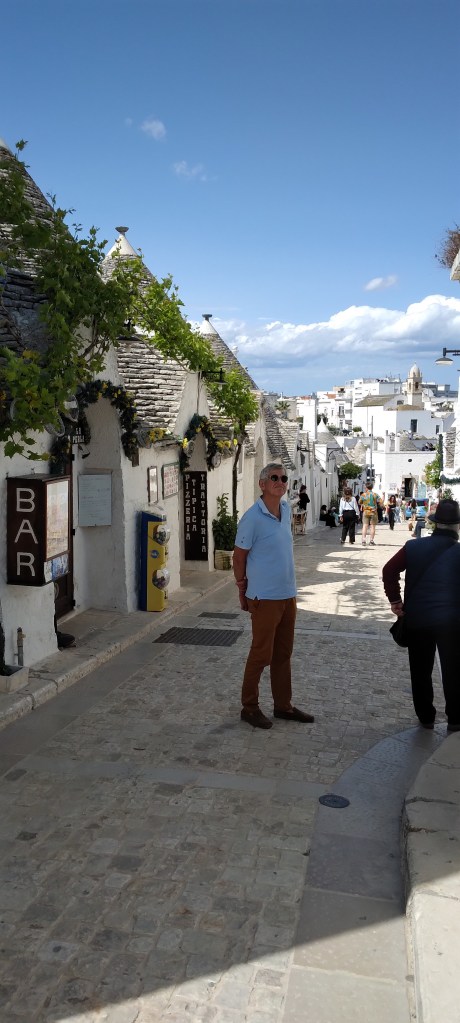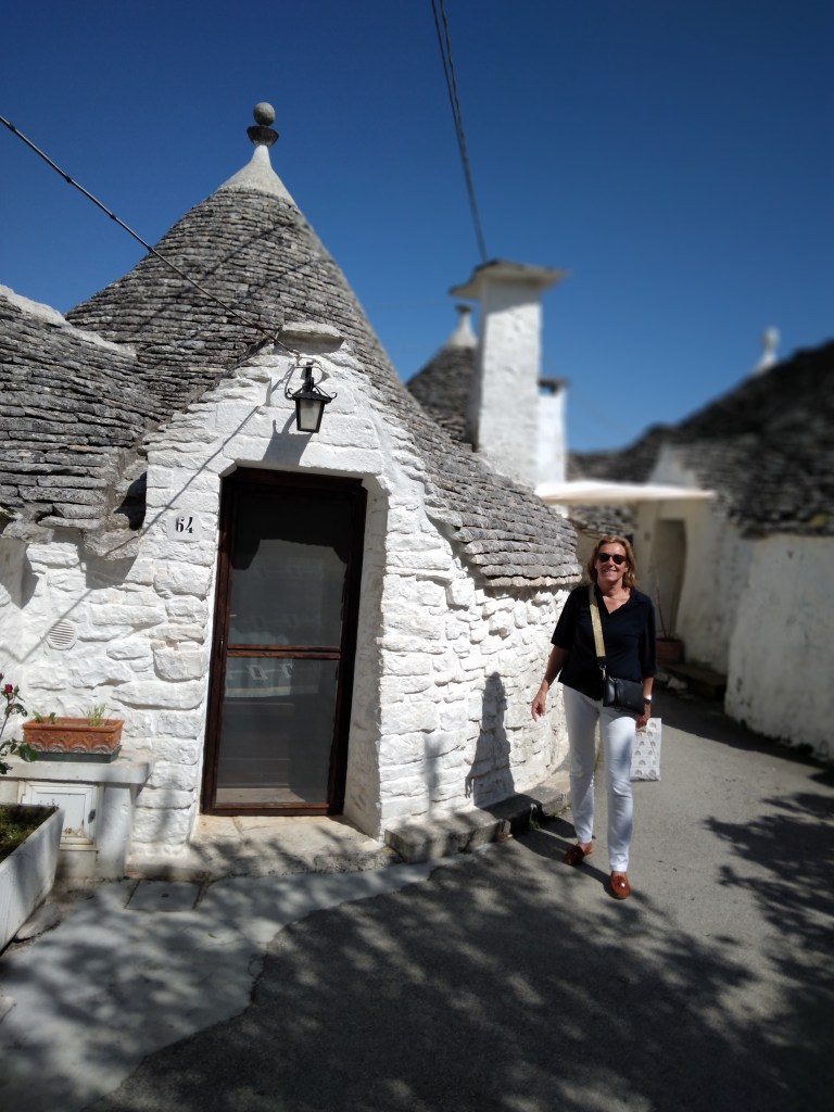 De volgende halte is Alberobello, het beroemde (Unesco) Trullidorp. We lopen eerst door het toeristische deel en daarna aan de andere kant van de doorgaande weg op de tegenoverliggende heuvel door het rustige deel, dat meer een woonbuurt lijkt te zijn. Het is een heel bijzondere bouwstijl uit de 15e eeuw. De stenen op het kegelvormige dak lagen oorspronkelijk los gestapeld zodat je de hele zaak snel kon laten instorten. Zo hoefde je in die tijd geen belasting voor je huis te betalen.