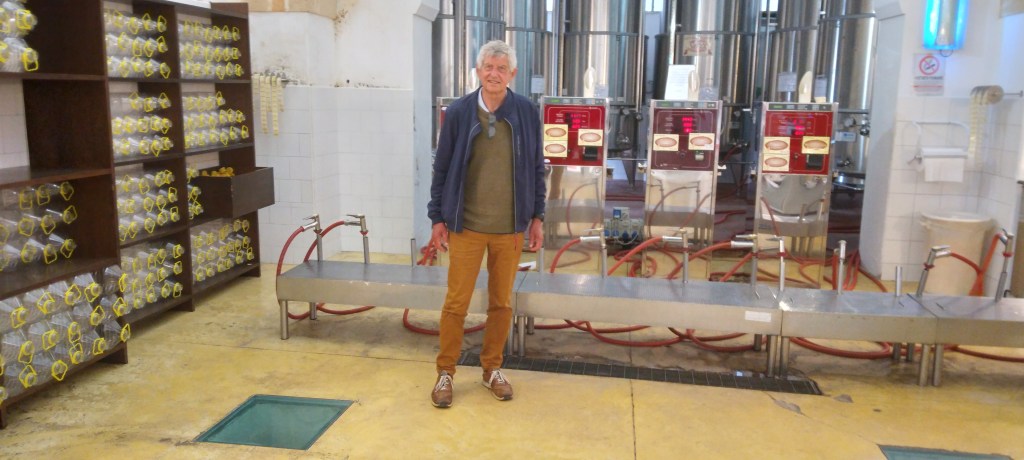 Na de lunch gaan we naar het wijnmuseum. Dat stelt niet heel veel voor maar het complex waar het ligt is enorm. Hier zetelt de cooperativa di Manduria, waar ze bijna honderd jaar geleden de basis hebben gelegd voor de eerste DOCG (beschermde herkomstbepaling) van de Primitivo. Tot lang daarna werd de wijn hier nog steeds in bulk verkocht om wijnen uit Nood Italië mee “aan te sterken”. Maar sinds de jaren 80 en 90 is er echt de ambitie gekomen om van de Primitivo een eigen goede DOCG wijnproduktie te maken. Met de 9000 hectare van de cooperativa tezamen wordt er in allerlei kwaliteiten wijn gemaakt; de meest eenvoudige kun je gewoon tanken uit een soort benzinepomp in jerrycans. Maar ze maken ook dure prijswinnaars. Na wat proeven kopen wij iets er tussenin, Rosato en Rosso. En natuurlijk 2 flessen Verdeca die ze hier ook zelf verbouwen. Voldaan rijden we weer naar de boot….