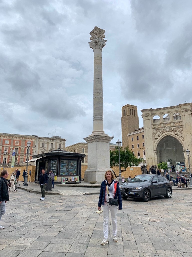Marleen bij de tweede zuil van het einde van de via Appia. Deze hoort in Brindisi te staan maar is ooit hierheen verplaatst
